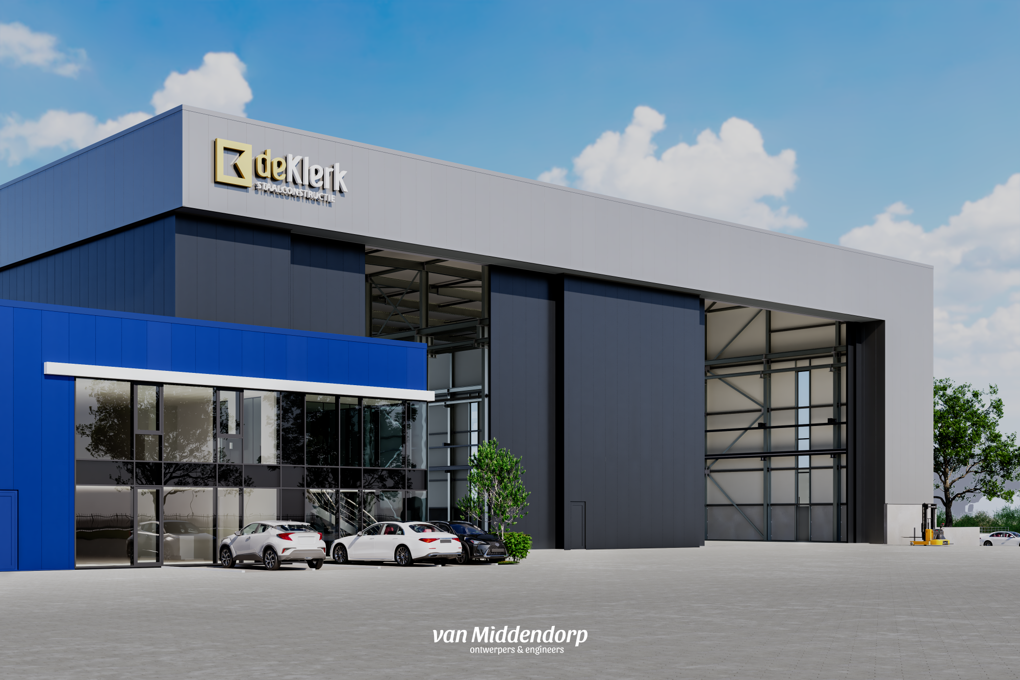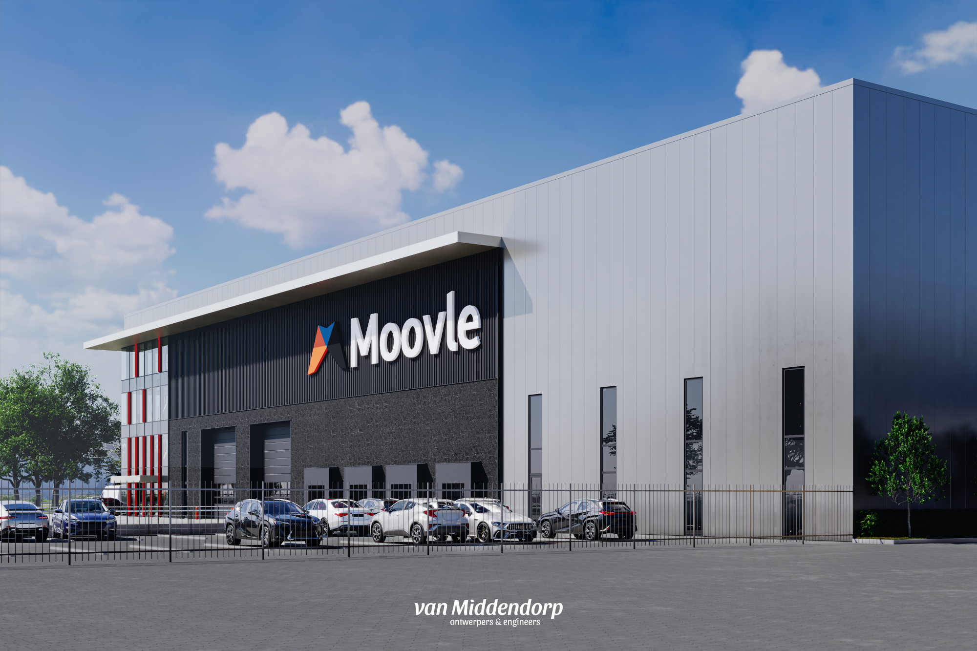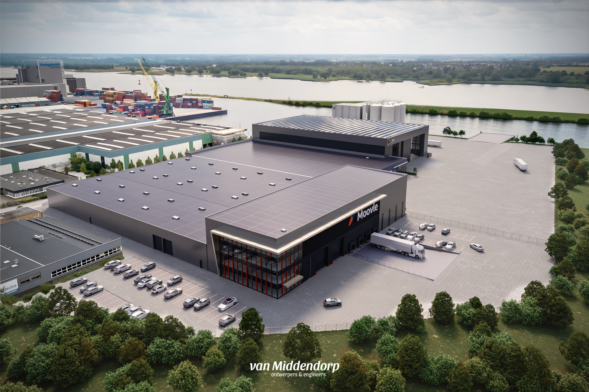De huidige bedrijfspanden, gelegen tussen de A27 en Avelingen-Oost, krijgen een rigoureuze metamorfose. De ligging van het kavel biedt een uitermate goede locatie voor zwaar industriële activiteiten. Aan de zuidzijde van het pand wordt een nieuw volume gerealiseerd van 18m hoog. Deze wordt in gebruik genomen door De Klerk Werkendam. Door de grote schuifdeuren van 15m hoog en 10 meter breed, en de gigantische kraanbanen met een hijsvermogen van 100 ton, biedt deze nieuwe bedrijfsruimte alle mogelijkheden voor zware industriële activiteiten. Dankzij de directe toegang tot het water kunnen staalconstructies efficiënt over de Merwede worden aan- en afgevoerd. Aan de noordzijde van het pand wordt een nieuw volume gebouwd, met daarin een 3-laags kantoor. Samen met het achterliggende volume zal Moovle B.V. hier haar logistieke dienstverlening uitbreiden. De bestaande hal zal gerenoveerd en verduurzaamd worden. De kenmerkende blokken-architectuur van het nieuwe pand past perfect bij de strakke, functionele uitstraling van het industrieterrein en benadrukt de industriële aard van de locatie.
