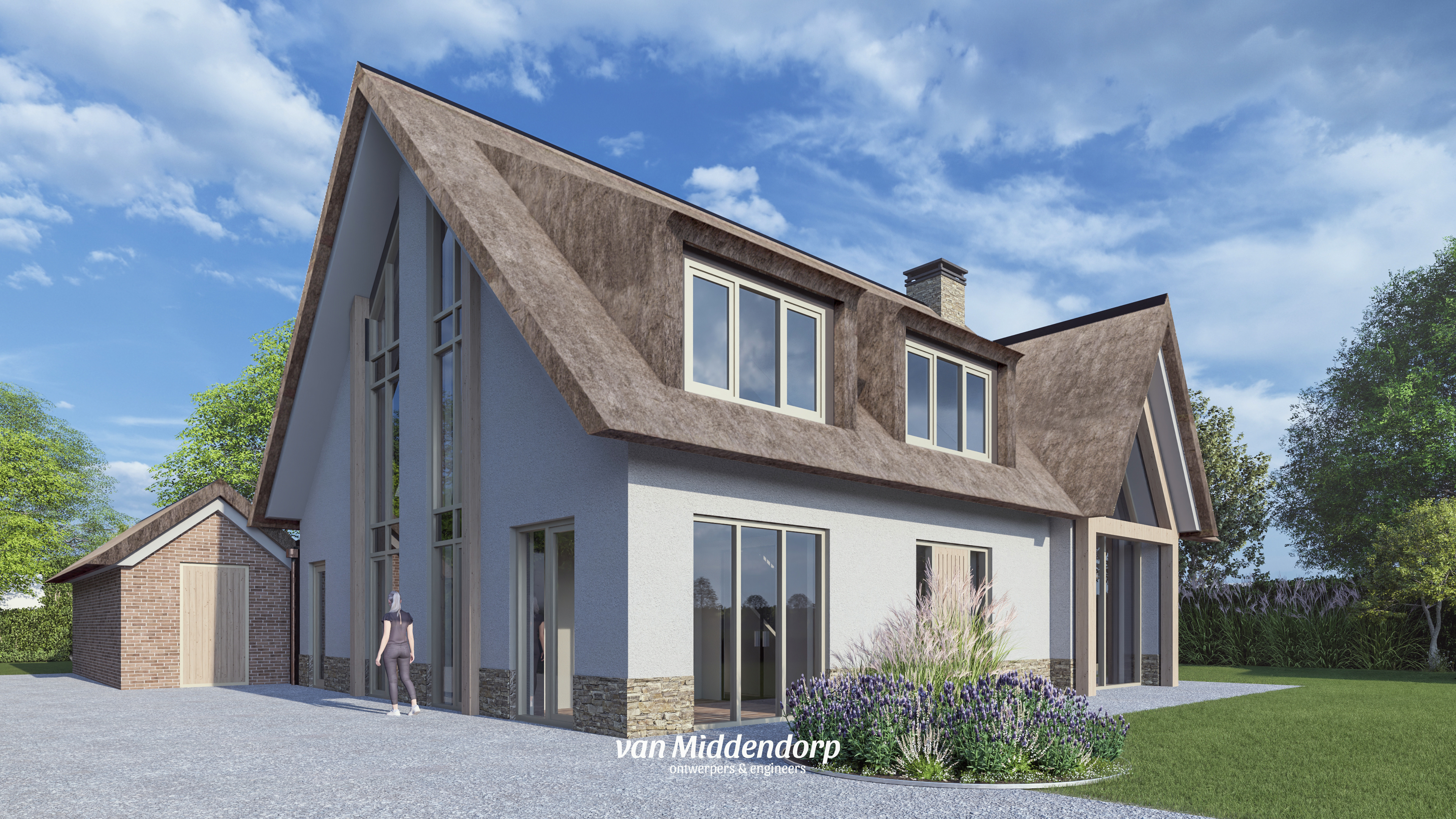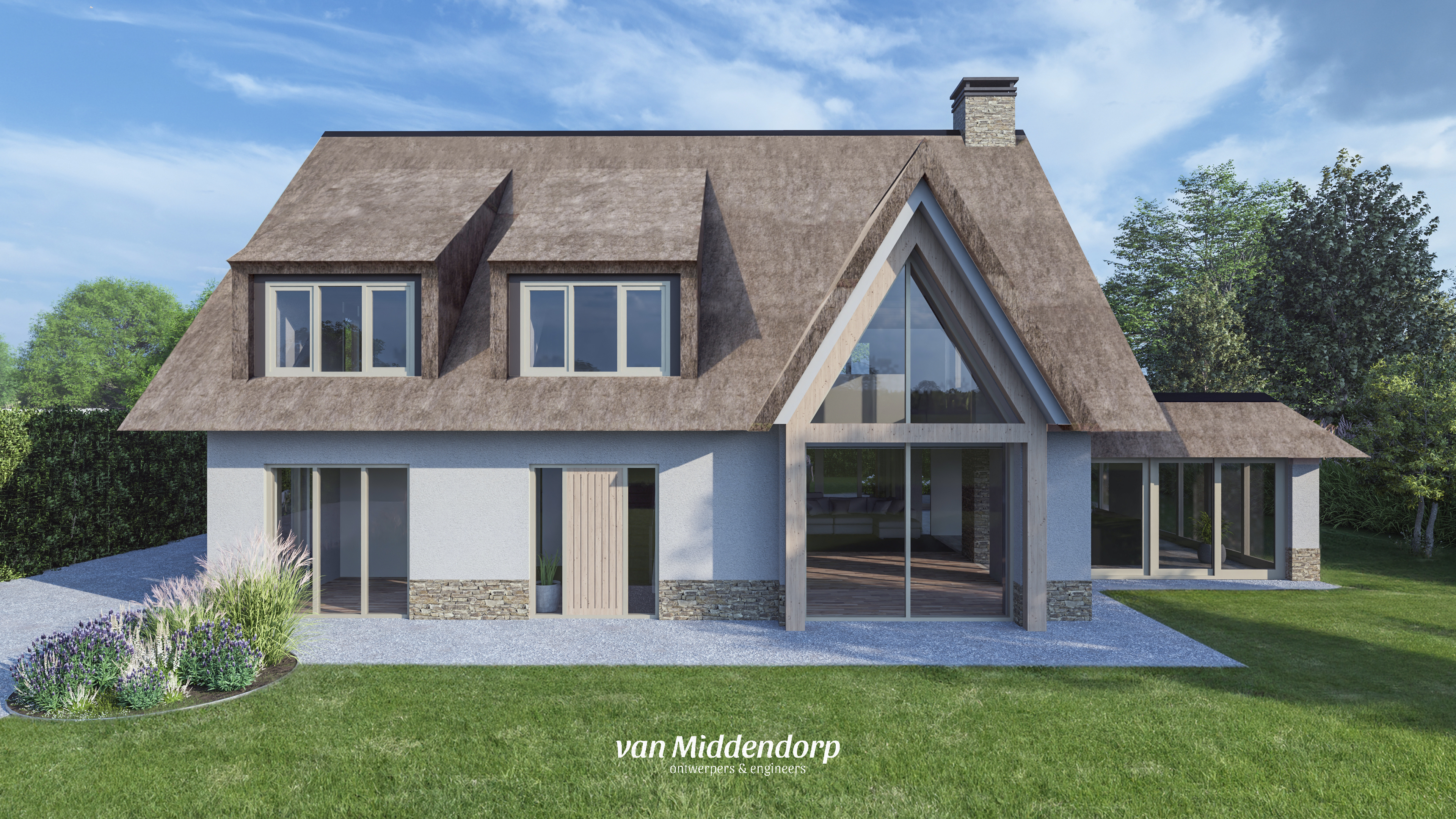 Het ontwerp is klaar en de omgevingsvergunning is rond! De verbouwing van deze prachtige vrijstaande woning in Limmen is in volle gang. De woning heeft een complete metamorfose gekregen naar een modern landelijke stijl, waarbij grote glazen elementen de uitstraling van de woning kenmerken. Met een karakteristieke rietenkap en een prachtige flagstone plint, biedt deze woning de perfecte balans tussen rustieke charme en hedendaags comfort. Gelegen in een rustige, groene omgeving, biedt dit ontwerp alles wat de opdrachtgever zocht: ruimte, rust en stijl.